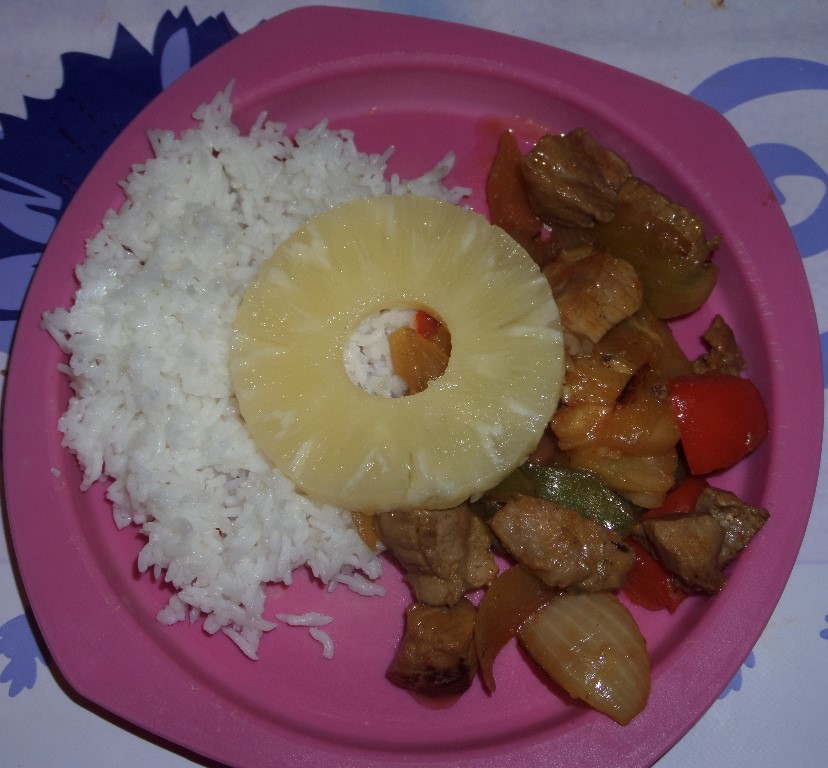 I decided to chop the meat off the bone and cut it into bite-sized pieces, along with the peppers and onions. Stir fry it in a little oil until the meat is cooked through but the peppers still retain some crunch. Add the pineapple chunks for the last couple of minutes, along with a slosh of juice from the can. Serve on a bed of rice with an extra pineapple ring on top.