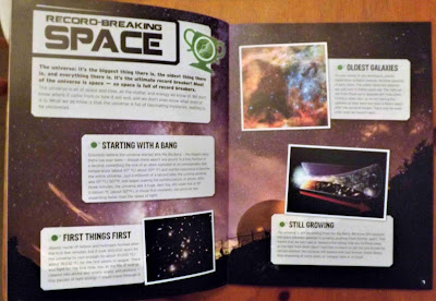 Packed with pictures and short texts, it's perfect for even reluctant readers to dig into, to learn all about everything that you may have ever considered about space, and a whole lot more. Meteor showers, animals in space, telescopes used, supernovas, dwarf planets, volcanoes in the solar system, asteroid strikes, ... even as a grown-up reading along, there is plenty to learn !